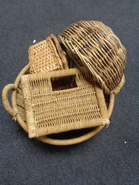 Five assorted wicker baskets