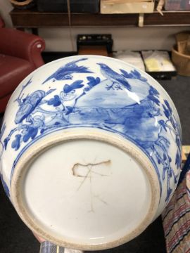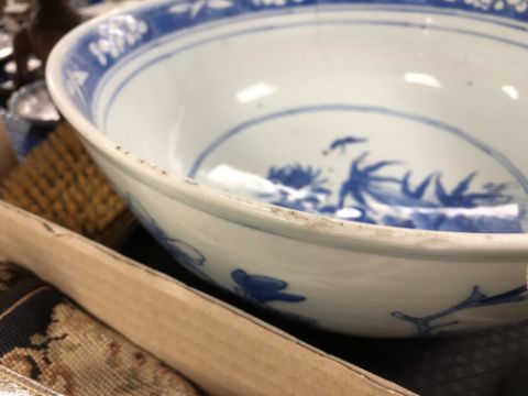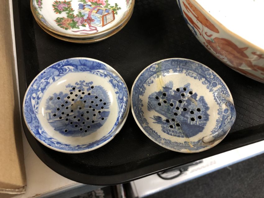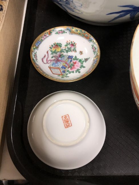 A tray of oriental wares, Chinese bowls, dishes and two blue and white pen stands