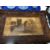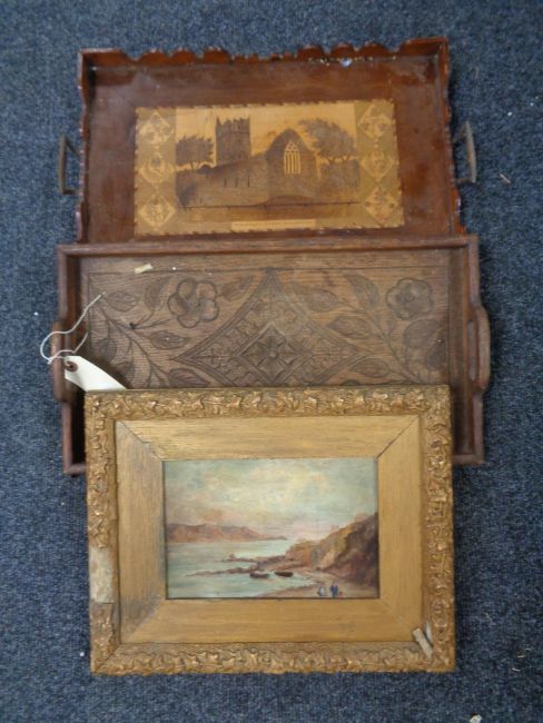 An antique gilt framed oil on board - Two figures by a boat, two wooden gallery trays
