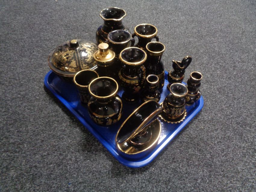 TRAY OF SMALL COLLECTABLES 5-10 ITEMS, SMALL RUG, INDIVIDUAL BOTTLE OF ALCOHOL      -  £20 + VAT