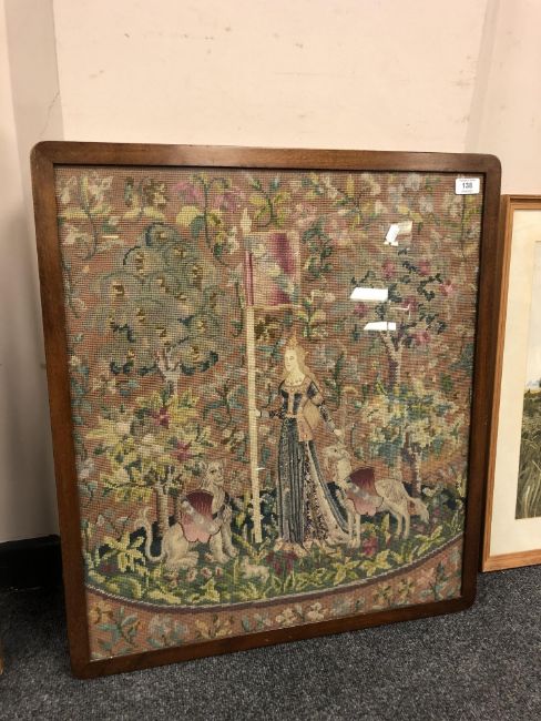 Early Twentieth Century School : A lady wearing long robes in a garden, tapestry, 66 cm x 58 cm, in glazed mahogany frame.