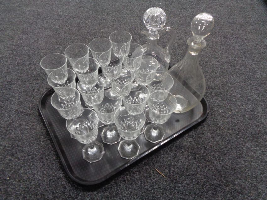 A tray of set of eighteen wine glasses, two glass decanters