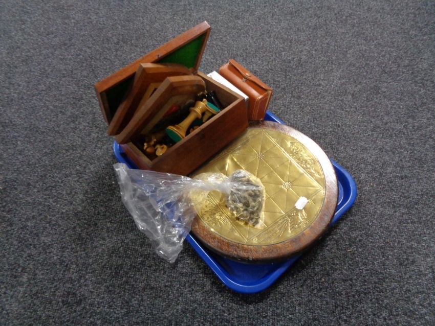 A tray of game board with tiger pieces, wooden chess pieces, card sets etc
