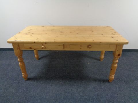 A pine farmhouse kitchen table together with a set of six rush seated ladder backed chairs