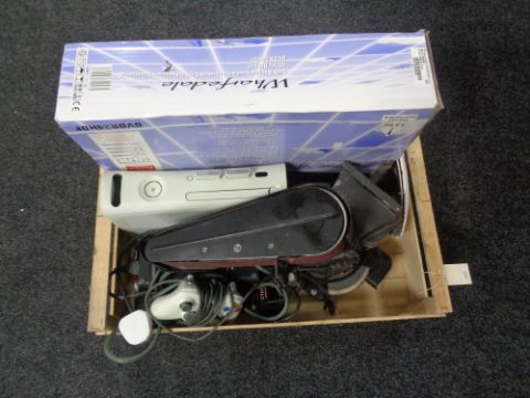 A box of Xbox 360 controller and accessories, bench grinder, dvd player