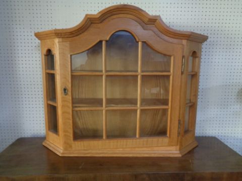 A blonde oak single door wall cabinet