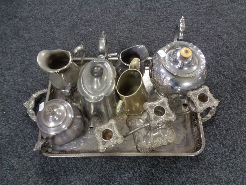 A tray of plated wares - twin handled gallery tray, candelabra, tea ware etc