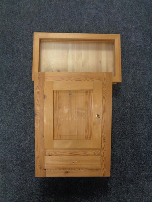 A pine counter top display cabinet and a pine wall cabinet