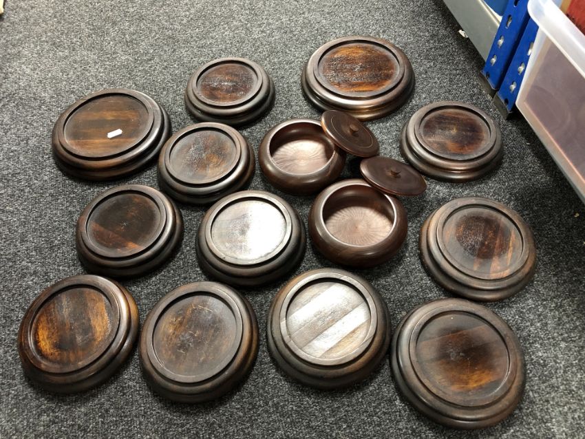 A box of wooden stands and lidded bowls, lidded jewellery box, magazine rack etc
