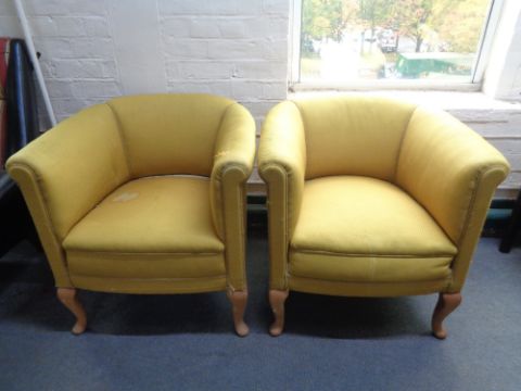 A pair of 20th century tub chairs in mustard fabric on oak legs