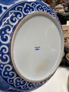 A hand painted blue and white glazed pottery bowl with plated rim together with a further blue and white floral bowl, pottery bowl.