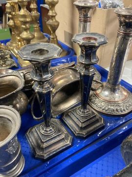 A tray of twentieth century plated wares, miniature wine coolers, serving spoons, sugar basin and milk jug etc