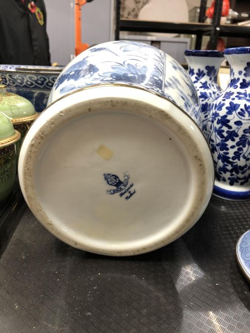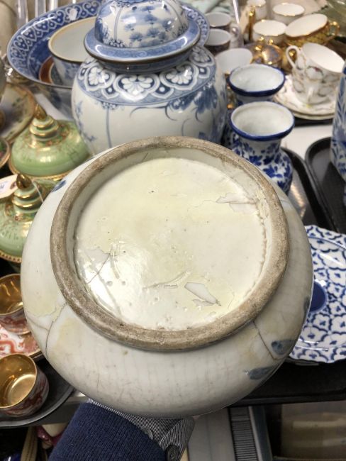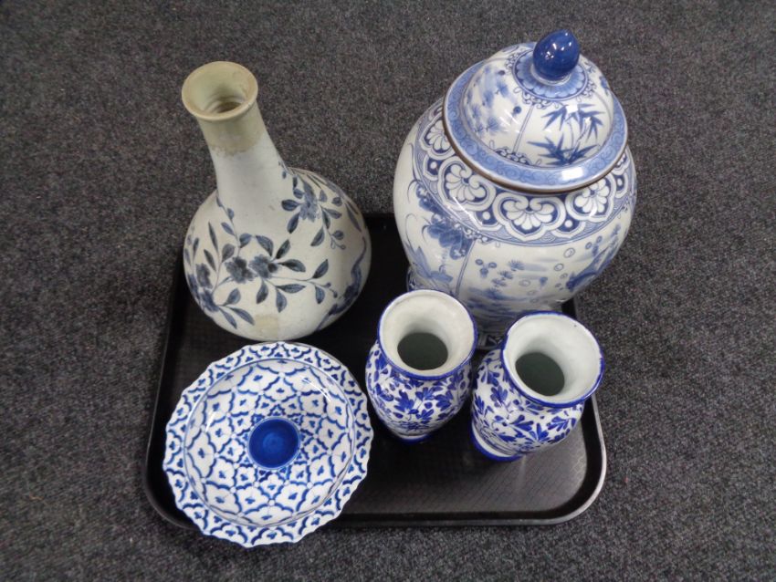 A tray of antique Chinese glazed blue and white vase, shallow dishes and vases etc
