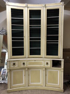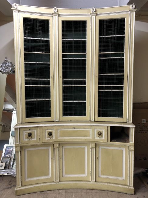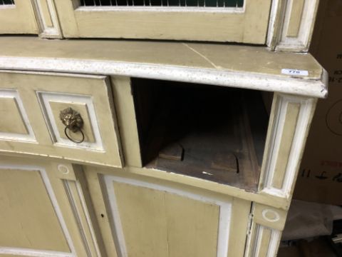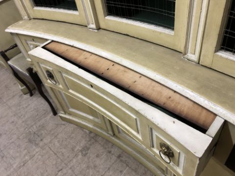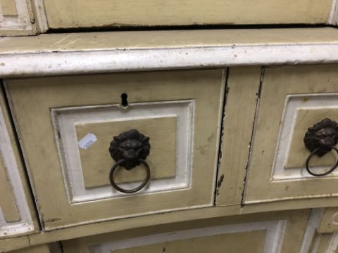 One drawer missing, sadly. Central secretaire drawer is very stiff. Key present but locks rather temperamental. Doors very stiff to open. Losses to paint in numerous areas. See additional images.