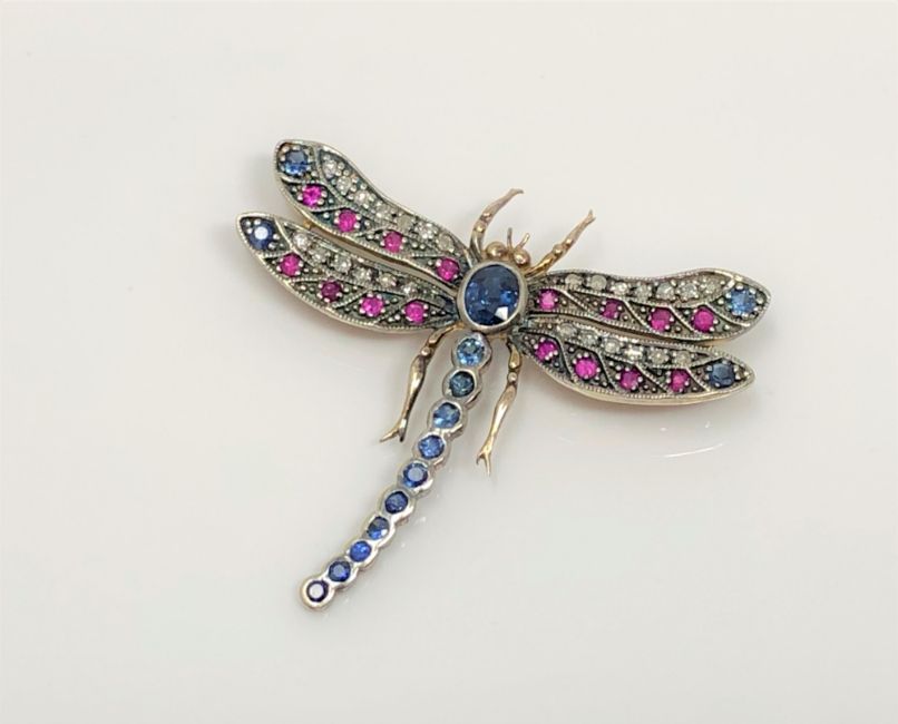 A fine sapphire, ruby and diamond brooch modelled as a dragonfly, length 4cm