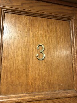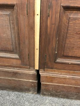 There should be nine keys in total for each door and its corresponding cupboard beneath. We only have keys 1, 2, 3, 6, 8, and 9. Door 5 is unlocked, all the others are locked without keys. Damage to wood at rear-left of cabinet 1. Small losses to moulding in a couple of places. Replaced section of oak between cabinets 7 and 8. Replaced section of oak on right side of cabinet 9. See additional images.