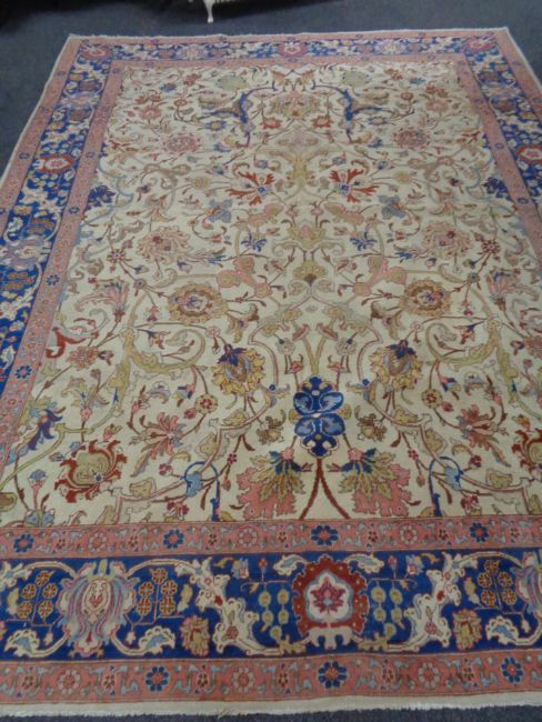 374cm by 280cm. Pile thinning in some areas. Some stains visible around the edges. The carpet would benefit from a clean. See additional images.