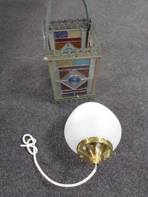 The lantern is 20cm high by 19cm deep and 19cm wide. Including the hanger the height is 74cm. This has previously been wired but now has no bulb or wires in it. The glass panels are somewhat loose.