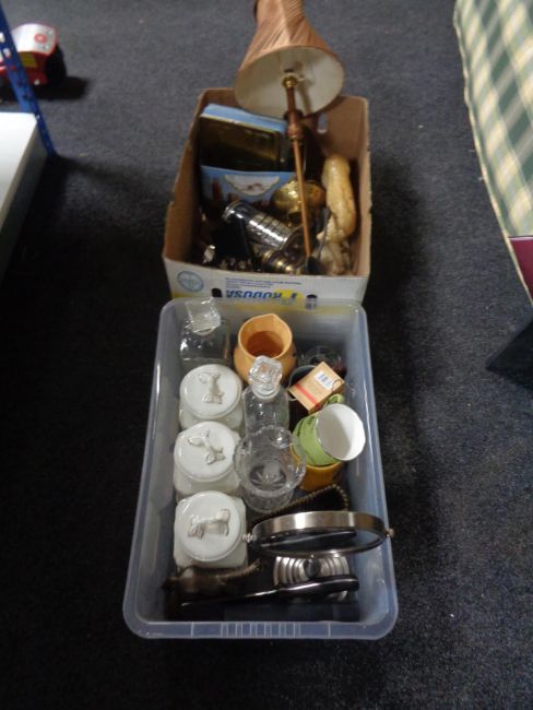Two boxes of decanters, storage jars, mirror, chopping knife, table lamp etc