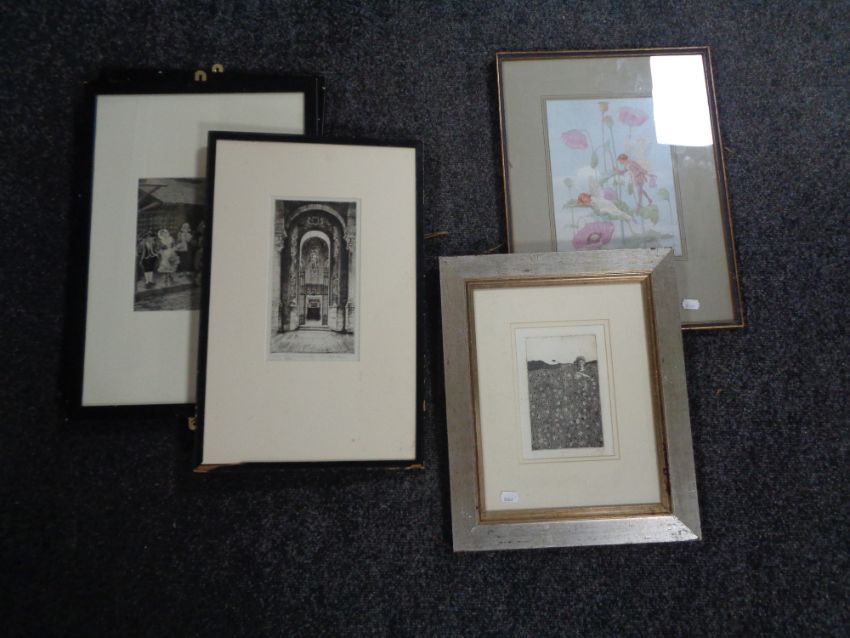 A framed Margaret W. Tarrant flower fairy print - Poppies, together with four further black and white prints etc