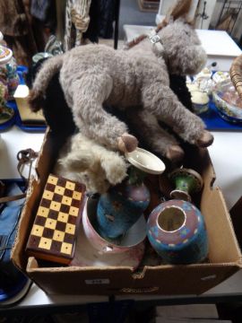 A box of old soft toys, donkey, cribbage board, antique china etc