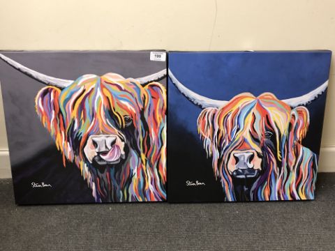 After Steven Brown : Highland Cattle Studies in Multicolour, a pair of colour prints on canvas, 40 cm x 40 cm, both parts unframed. (2)
