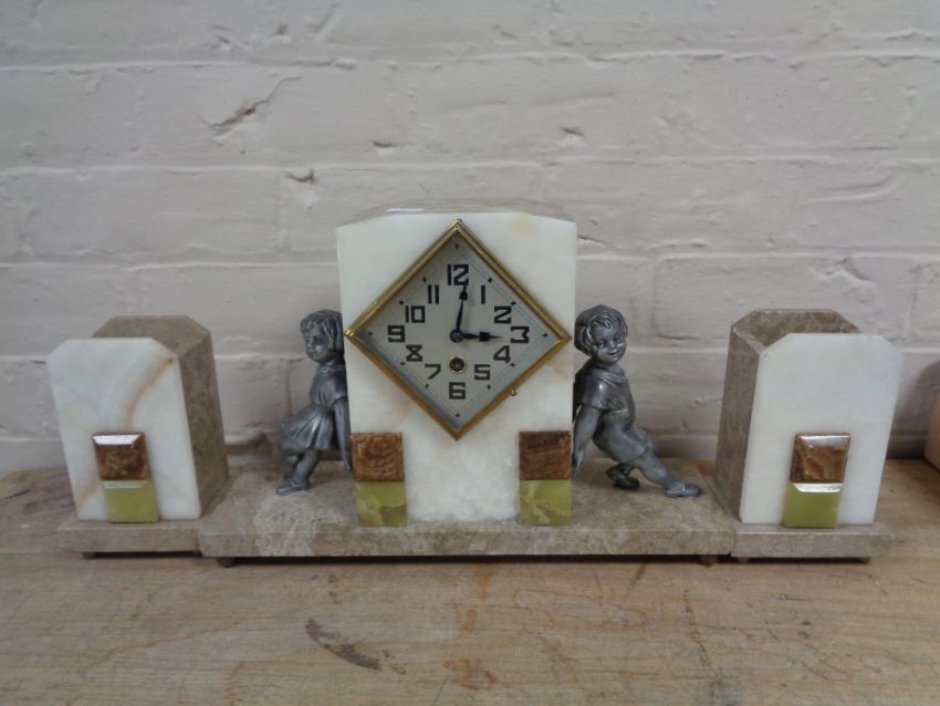 A three piece marble Art Deco clock garniture with pendulum and key