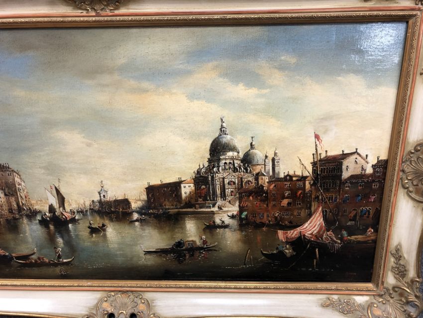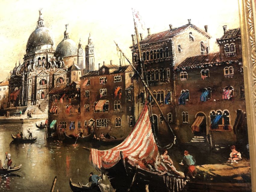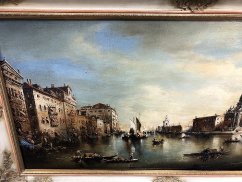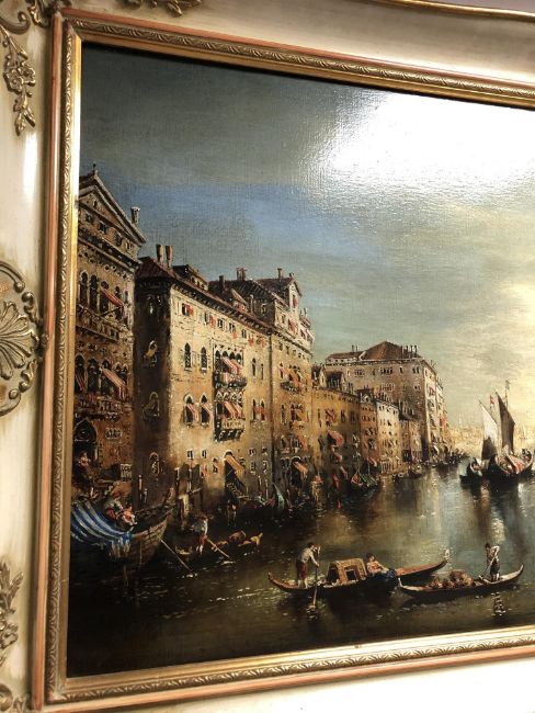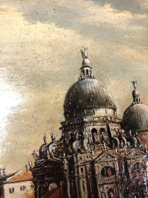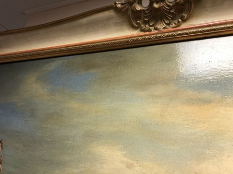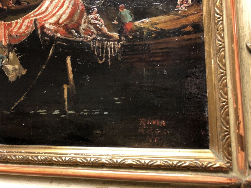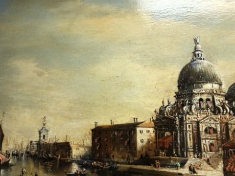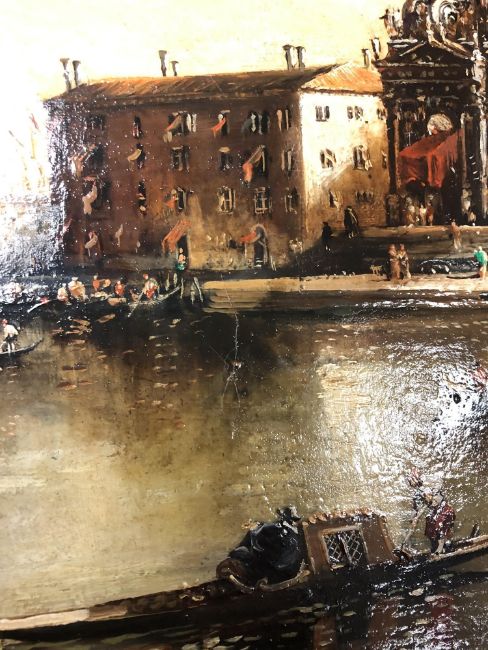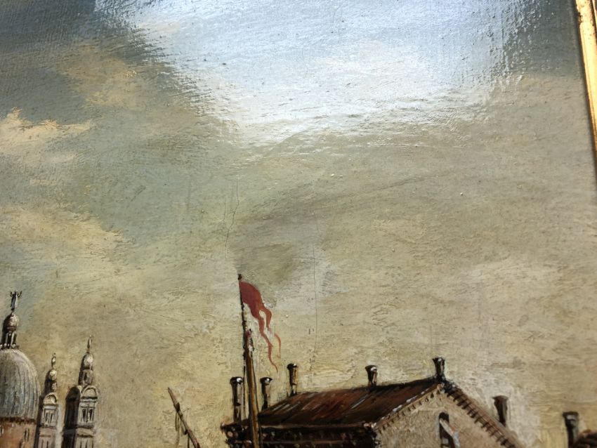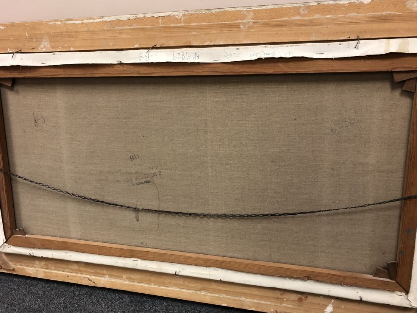 Canvas would benefit from cleaning. Surface yellowed with nicotine staining and also with general surface dirt. Some areas of craquelure to surface, see close ups. I cannot see any damages or repairs to the canvas.