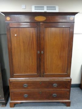 A Regency inlaid mahogany double door linen press converted to a wardrobe, a/f 133 cm x 63 cm x 189 cm.