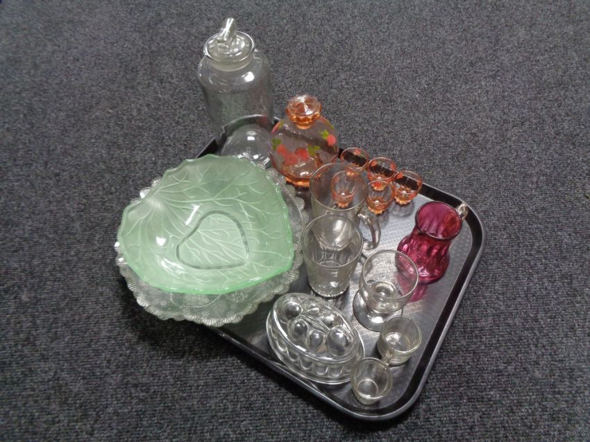 A tray of antique and later glass ware, etched goblet, jelly mould etc