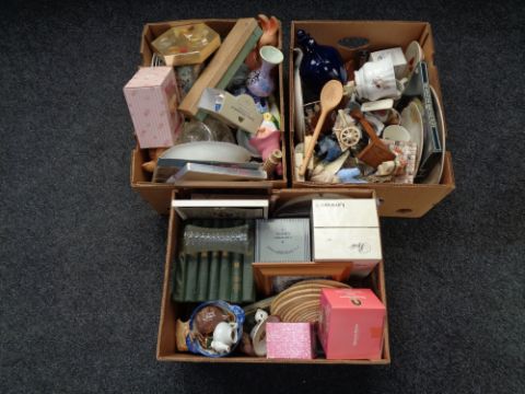 Three boxes of Charles Dickens books, chalk dog figure etc