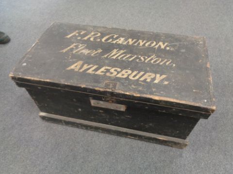 A 19th century painted pine blanket chest bearing writing F. R. Cannon, Fleet Marston, Aylesbury