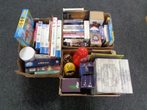 Three boxes of DVD's, board games, Russian dolls, jigsaws etc