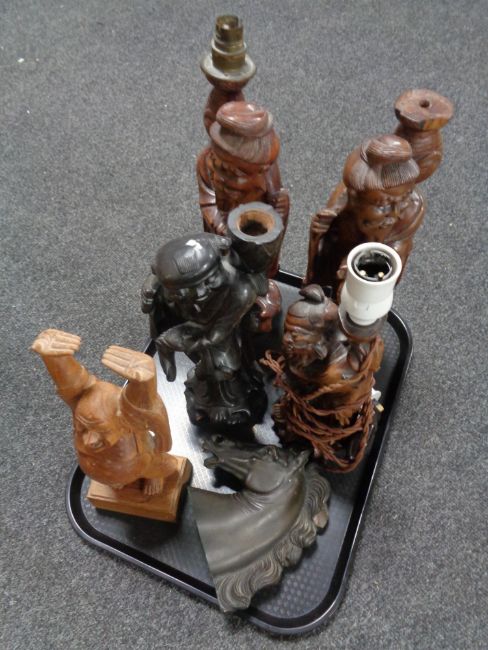 A tray of plaster bust, horses head, five carved Eastern hardwood figures and lamps