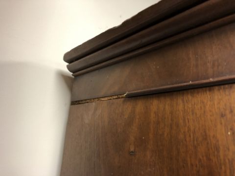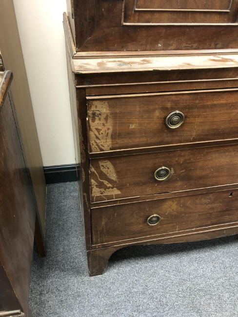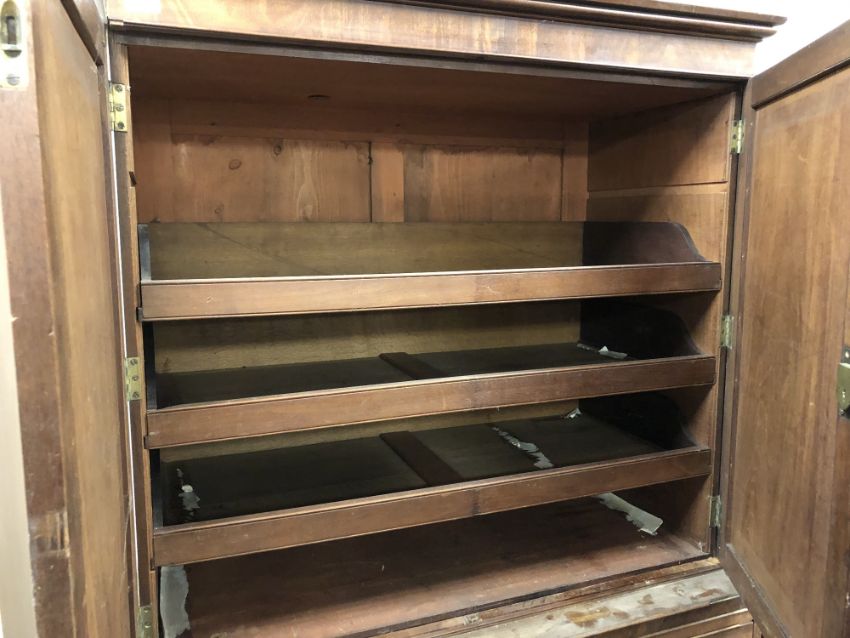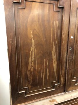 187cm high by 107cm wide by 57cm deep. Numerous veneer losses. Small strip of moulding missing from upper left. Some water marks. Later handles. Original interior. See images.