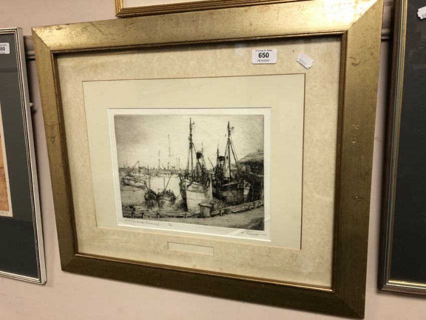 W Lishman : Waiting for the tide, Scarborough, etching, numbered 8/60, signed with margins, 20 cm x 29 cm, framed.