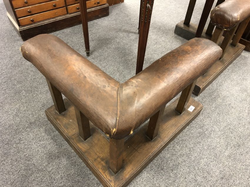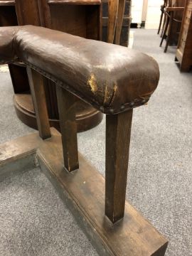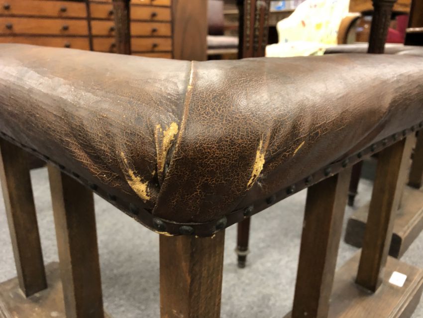 This is in two separate halves, each measures 60cm wide by 52cm deep by 46cm high. Leather starting to tear in some areas. Timber generally dull and faded. See images.