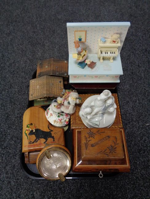 A tray of wooden trinket boxes, ashtray, musical figurine etc