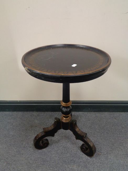 A Victorian ebonised wine table on three way pedestal and gilded decoration