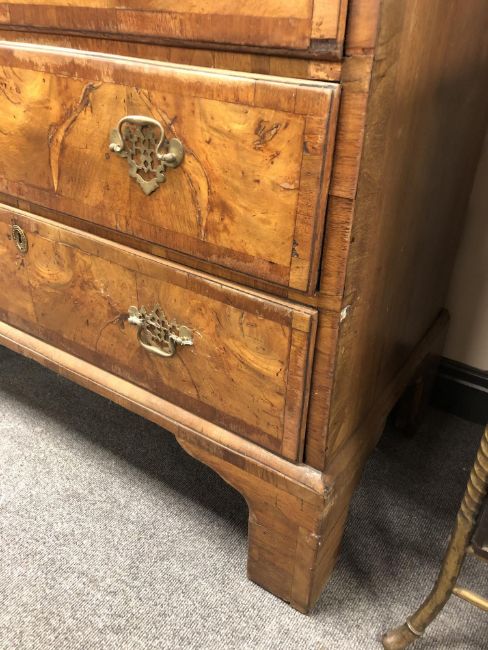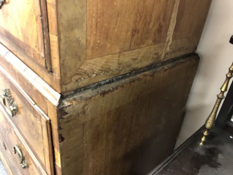 178cm high by 102cm wide by 51cm deep. Numerous veneer losses and old replacements. Section of moulding missing from right side. Later handles. Drawers rather stiff. See additional images.