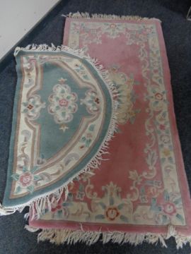 A pink fringed Chinese floral rug and a green fringed d-shaped rug