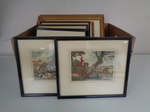 Two boxes of antiquarian hand coloured engravings, hunting and shooting scenes etc