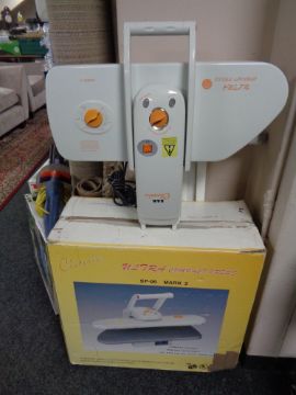 An Ultra compact steam iron press, boxed together with stand
