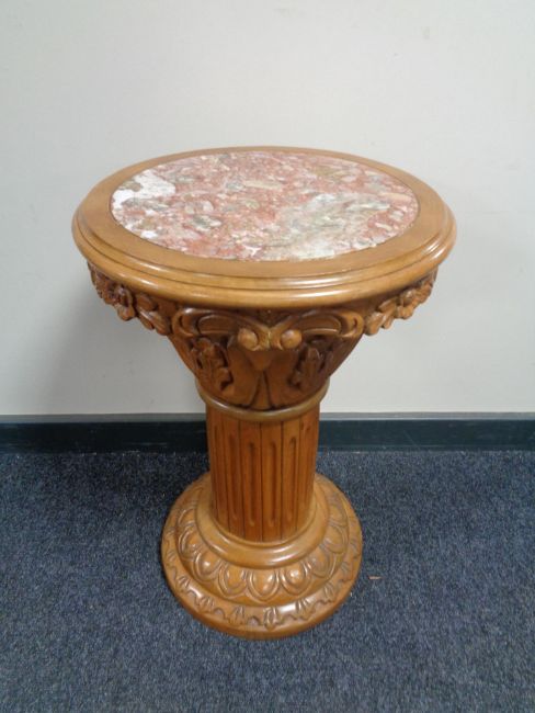A carved pine marble topped plant pedestal