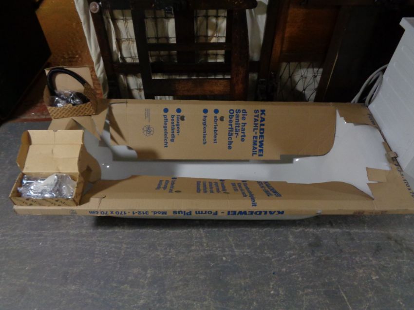 A bath and two boxes of taps and fittings