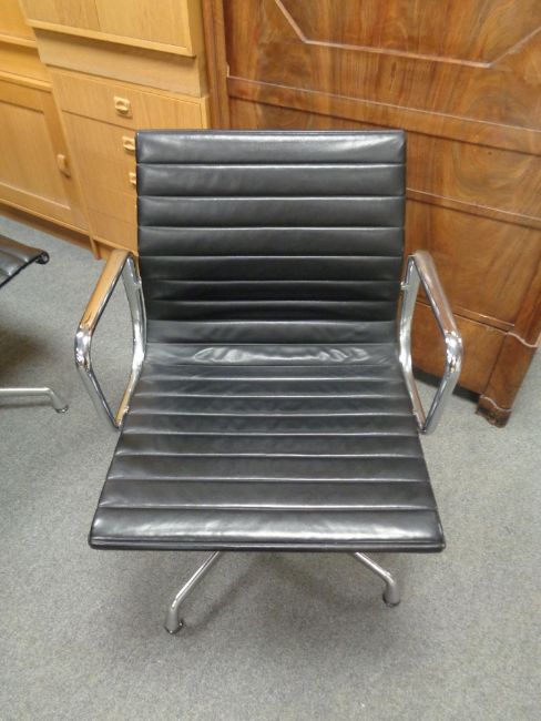 A Vitra Charles Eames designed Alu swivel armchair upholstered in black leather with chrome frame