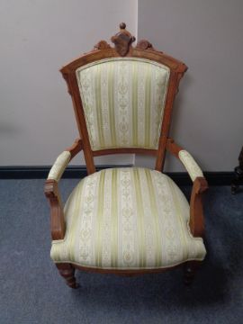 A continental walnut salon armchair in green classical fabric