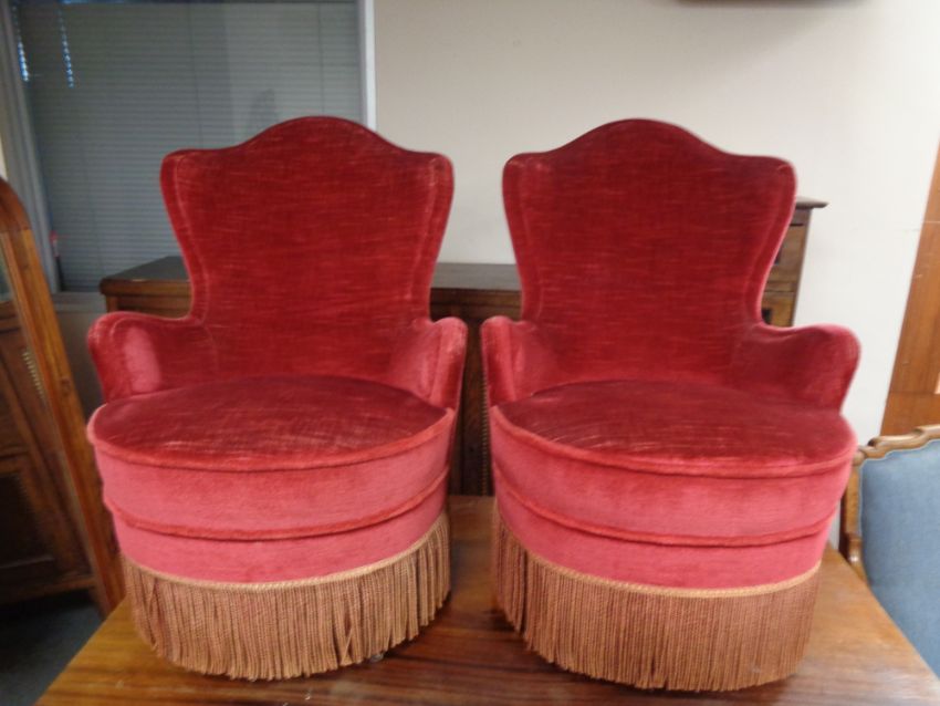 A pair of salon armchairs in red tasselled upholstery