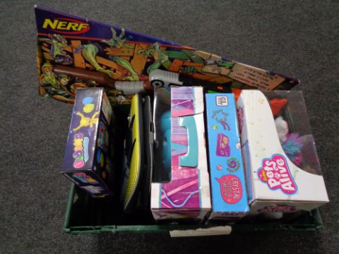 A crate of toys including Nerf gun, crystal tattoos, jewellery kit, Batman bag etc
