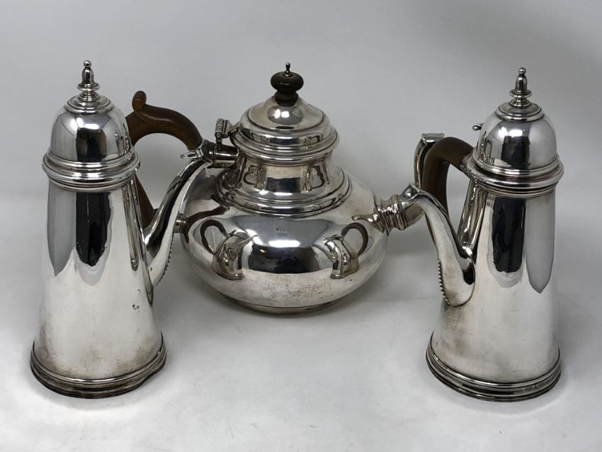 A Brittania silver teapot together with pair of coffee pots, 2295g. (3)
